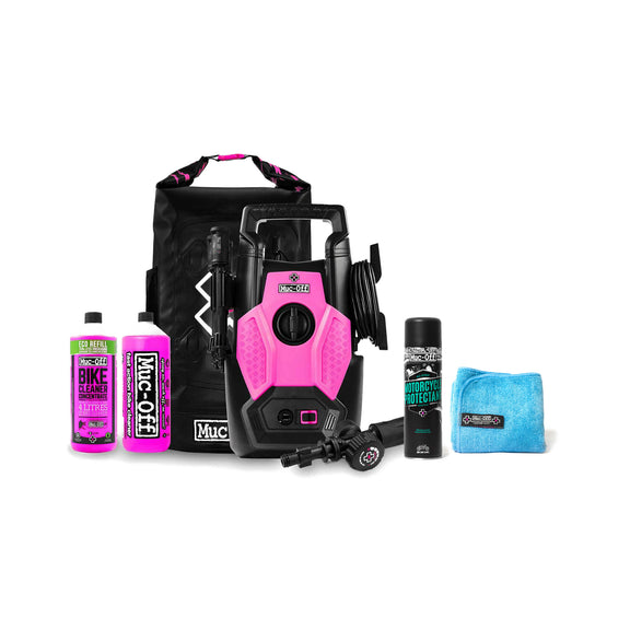 De ultieme bundel voor iedereen die zijn motor, auto of fiets grondig én veilig wil reinigen. De Muc-Off Hogedrukreiniger is speciaal ontwikkeld voor kwetsbare onderdelen, en in combinatie met de meegeleverde accessoires en reinigingsproducten krijg je professioneel resultaat in je eigen garage.